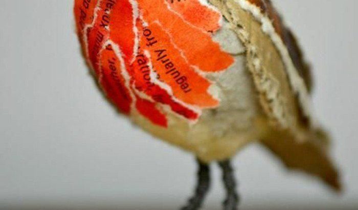 escultura de papel maché, pajarito en papel blanco, naranja, rojo y marrón, decoración natural